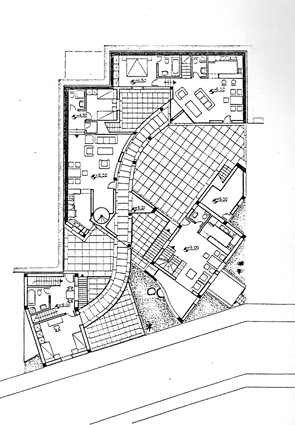 | The core element of the complex is the S-shaped path that "connects" the houses. This covered passage obtains conceptual and functional importance. It unions the houses and indicates a different approach on "cohabitation" that departs from the common examples of apartment buildings. |