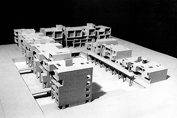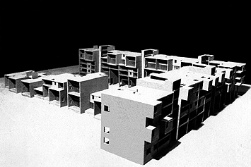| The core idea of the composition is the unfolding of a network constituted by two-storey houses, and of their circulation nodes. The houses and their circulation nodes merge in an extensive built organism that expands horizontally and vertically. |