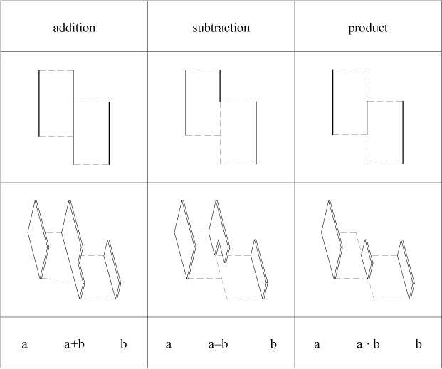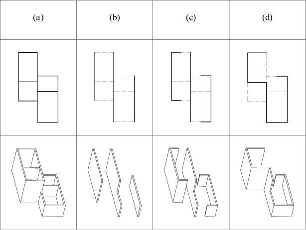 | TABLE 2. Examples of operations with non-atomic spatial elements: lines and solids representing walls. In all examples, shape a appears on the left, and shape b on the right. The produced shapes a + b, a - b, a • b appear between a and b. |